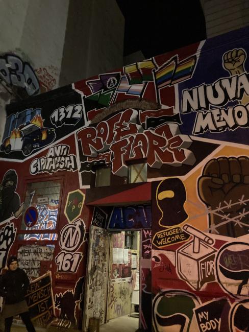 Nel pomeriggio facciamo l’incontro – 𝕤𝕔𝕒𝕧𝕒𝕣𝕖 𝕓𝕦𝕔𝕙𝕚 𝕕𝕚 𝕟𝕠𝕥𝕥𝕖 è un formato di mappa/conversazione, è un groviglio di g͎r͎o͎v͎i͎g͎l͎i͎o͎ ͎d͎i͎ ͎c͎o͎s͎e͎ ͎i͎n͎g͎a͎r͎b͎u͎g͎l͎i͎a͎t͎e͎, in cui – insieme a Paola – attraversiamo pratiche performative e ricerche vagabonde fatta con altrx, partendo da frammenti sonori e immagini: il progetto nomade SO IT IS con tutti i suoi nodi spaziali e relazionali, il movimento transfemminista di Non Una Di Meno in Italia e che tipo di domande e di attivismo ha attivato nel mondo artistico che frequentiamo, come le azioni di anasuromai (2017) e poi sulla statua di Montanelli (2019) nello spazio pubblico, e da lì però tornare indietro alle voci – fragili, ancora nascenti, per la prima volta a prendere parola – della prima manifestazione femminista a Campo de’ Fiori nel 1972, la presenza luminosa quel giorno di Mariasilvia Spolato, primo atto di visibilità lesbica in Italia, e poi di voce in voce le occupazioni culturali in Italia degli anni Dieci (Teatro Valle, Macao e altre) partendo dal grido di Silvia e di Judith Malina nel Teatro Valle Occupato in The plot is the revolution di Motus, dentro una mappa scomposta delle lotte di artistx e lavorat^ dello spettacolo arriva all’occupazione del Globe Theatre a Roma del 2021 in piena pandemia, e poi ancora uno sguardo su come la performance crea e riscrive lo spazio pubblico, l’indagine – affettiva, amorosa – sull’efemeralità delle vite e degli archivi queer.