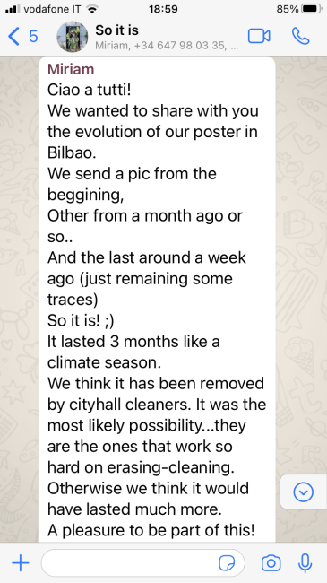 Finiamo, inizia l’azione sonora di Itziar e Myriam. Stiamo, tra il dentro di bulegoa e la strada, le lattine di birra in un secchio con ghiaccio, tra l’italiano e il castigliano, mentre in un altro secchio Silvia e Leire sciolgono la colla per il poster, e Miriam e Itziar discutono su dove attaccare il poster. Partiamo, secchio e pannelli, una trentina, scendendo le scale del barrio. E dopo il ponte, vicino all’acqua scegliamo il muro.